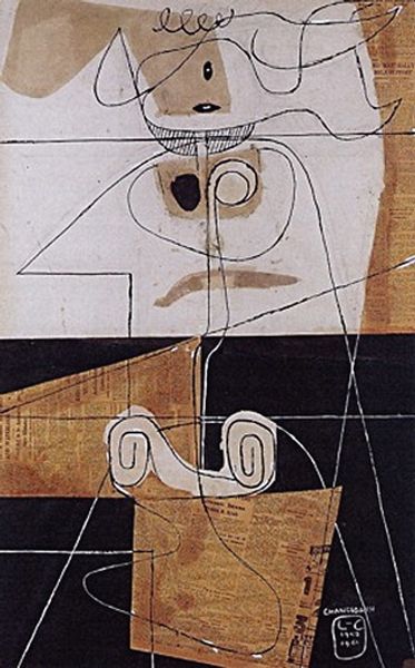 Editor: Here we have Josef Capek’s “Toy Seller,” painted in 1917. It’s an oil painting that presents a rather stern-looking man holding a toy bird. It feels melancholic, almost like a memory fading. How do you interpret this work? Curator: The toy bird becomes an incredibly poignant symbol when viewed through the lens of cultural memory. Birds often represent freedom, the soul, even fragility. Considering Capek painted this during World War I, might the toy bird represent the innocence of childhood threatened or lost in the face of conflict? The barred window hints at entrapment, a world confined by war. Editor: That's fascinating! I hadn't considered the window as a symbol of confinement. The man's expression adds to that sense. Is he selling innocence, or protecting it? Curator: An excellent question! Look at the man's face. He seems impassive, his features almost mask-like. Is he a merchant of dreams, or is he guarding a remnant of hope? Does the limited palette of blues and browns evoke a sense of mourning, a quiet lament for what’s been lost? Editor: Yes, that limited palette really amplifies that feeling. It's interesting how Capek uses these geometric shapes to construct the figure; it feels very modern, but also somewhat distancing. Curator: Exactly. The geometric forms can signify a break from tradition, a world reshaped by new, and often harsh, realities. The sharp angles contrast with the implied roundness of the bird, heightening its preciousness. Editor: I see it now; that small splash of bright blue takes on so much more meaning within the context of all the muted colors. I will certainly look at the painting in a completely different way now! Curator: It’s remarkable how seemingly simple symbols, when combined, can unlock deeper emotional and cultural resonances, isn't it?