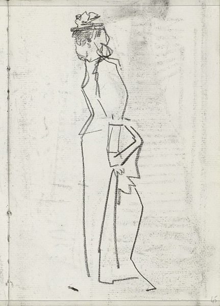Editor: This is George Hendrik Breitner’s “Standing Female Nude,” a pencil drawing from around 1895 to 1898. There’s a raw vulnerability to it, and I'm struck by how modern it feels. What do you see in this piece? Curator: I see a deliberate subversion of traditional academic nudes. Breitner isn't interested in idealizing the female form; he's showing us a real woman, in a real space, rendered with a gritty honesty. The visible pencil strokes, the almost unfinished quality—it all contributes to a sense of immediacy that challenges the male gaze often associated with nudes in art history. Where do you think this drawing fits within the context of late 19th-century representations of women? Editor: It feels like a move towards realism, but perhaps also a shift in power. She isn't posing for anyone, it seems; she's just existing. Curator: Exactly. Breitner was known for his street photography and capturing everyday life in Amsterdam. This drawing, in its own way, continues that project. Consider the social and political movements of the time: increased visibility and agency of women, discussions around sexuality, and changing artistic conventions. Does the apparent ‘unfinished’ quality undermine or reinforce this sense of agency, in your opinion? Editor: That's a good question. Maybe it does both? It leaves room for interpretation, forcing us to actively engage with the subject rather than passively consume a perfected image. Curator: I agree. It acknowledges the subjectivity inherent in viewing and representing another person. Ultimately, Breitner is prompting us to confront our own assumptions about beauty, representation, and the female body. Editor: I'm now viewing it less as just a nude and more as a statement. It is a powerful look at individuality and agency in a period of shifting societal norms. Thanks! Curator: Indeed. These nuanced readings show how important the conversation between past and present truly is.