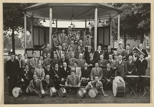 Editor: Here we have a photograph, “Groepsportret met bruidspaar Henriëtte Boelen en Jan Laverge omringd door gasten,” by Nicolaas Schuitvlot, dated circa 1935-1937. It’s currently at the Rijksmuseum. There’s such formality, everyone dressed in their finest, and yet the sepia tone lends a real sense of history. What can you tell me about this work? Curator: It’s fascinating to consider how photographs like this functioned in the 1930s. Wedding photos are so ubiquitous now, but back then, this would have been a more staged, significant representation of social status and familial connection. Think about the clothing, the setting, the way the subjects arrange themselves; what message are they collectively trying to project to their community and to future generations? Editor: It’s definitely a display of wealth and union, with everyone looking poised. There are different seating heights and everyone is making direct eye contact. How did these kinds of images affect how weddings were perceived at the time? Curator: That's the key question! It helped to codify visual conventions for weddings, impacting everything from dress codes to venue choices. Also, consider who is *not* represented in this photograph. Who was excluded and what does that say about the social hierarchies of the time? Does that change how we read their intent? Editor: That makes me wonder about other wedding photographs during that period and who were the subjects. Thank you, I now have more questions to consider about photography. Curator: Exactly. Art serves to ask new questions. Hopefully we both have some idea about wedding photography in the 1930s.