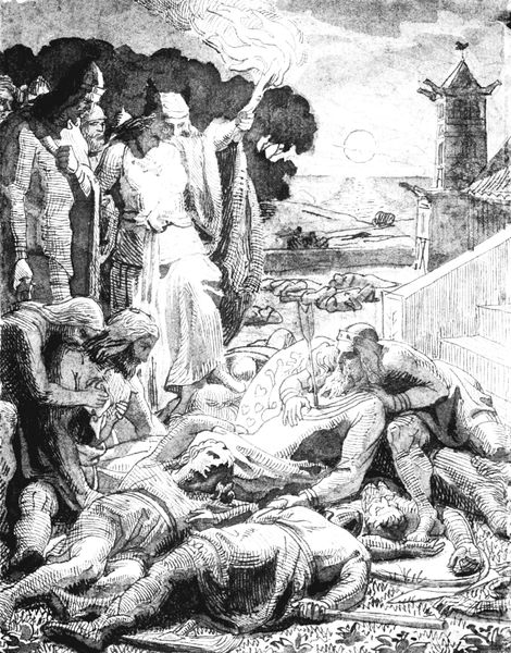 This is Gustave Doré's engraving "The Cruelties of Bibars." Doré made this work during the 19th century, at a time of increased Orientalism in Western art. The image depicts the aftermath of Bibars' conquest of Antioch, marked by a brutal display of power. Bibars, a Mamluk Sultan, stands triumphantly as his soldiers display the severed heads of Christian knights to grieving women. This scene reflects the historical clashes between Christianity and Islam during the Crusades, feeding into the era's orientalist fascination with violence in the 'East'. Doré's dramatic use of light and shadow heightens the emotional intensity, drawing viewers into the horror and despair of the conquered. The image serves as a stark reminder of the human cost of religious conflict and the power dynamics inherent in colonial narratives. It presents a biased view of the events, showcasing how historical narratives can be manipulated to reinforce cultural prejudices and political agendas.