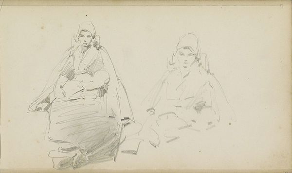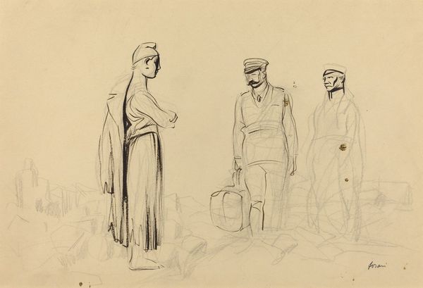 Curator: Welcome. Today, we're looking at a pencil drawing, During the Armistice, made circa 1914-1919, by Jean-Louis Forain. Artist: Oh, there's such palpable sorrow humming off this scene. Even though it's spare, nearly minimalist, I instantly felt drawn into the grief. What do you make of it? Curator: Forain created this piece during or shortly after World War One. It is a potent commentary on the war's human toll. You see a woman standing, her face tilted towards the sky, hands clasped as if in prayer or perhaps despair, as some people around her are crouching and two sketched persons at her sides. Artist: I do sense a glimmer of hope within her posture. I almost feel like I’m eavesdropping on her internal dialogue. I feel like I’m understanding what's she is mumbling towards hope while the other folks next to her feel distant, lost to a fog... or trauma, more likely. It's like a curtain of silence envelops them. Curator: Precisely, and it reflects the widespread emotional landscape of that time. The Armistice didn't magically erase the pain; instead, countless individuals had to navigate profound grief and an uncertain future, the loss. This drawing, I think, speaks to that unresolved tension. The figure of this mother may show a common icon present in media during and after war scenarios: it's painful in every time period and generation. Artist: Thinking about process, it makes sense to use such immediate materials to capture that intensity. Can you imagine trying to paint this sentiment? There’s an honesty to the pencil line. A rawness of this moment. Almost as if it has just been dug up. Curator: The rapid, almost unfinished quality is effective in communicating the immediacy and disruption of war. It resists romanticizing the subject and keeps the focus firmly on the emotional and human cost. I think it is impossible not to think of the mother on The Ghetto, the sculptor Meštrović did as well during this time... Artist: This drawing reminds me of what my grandpa once told me about losing his brother. You never quite close that chapter, and seeing it rendered so honestly… Well, that's a gift, even when it stings. Curator: Indeed. The drawing captures a moment, yet its themes remain relevant. Artist: Absolutely. Thank you for illuminating that connection for me, always shifting my perspective in thoughtful ways.