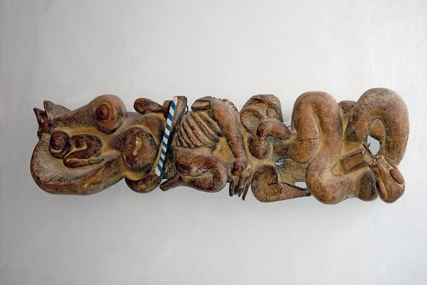 Curator: What a striking piece! The verticality and texture grab your attention immediately. Editor: Yes, a presence that dominates the corner in which it is installed. We’re looking at Patxi Xabier Lezama Perier’s sculpture, "Etxekoandre," created in 2012. It appears to be a wood carving and assemblage piece. Curator: The use of wood is critical, isn't it? The grain directs your eye, and the assemblage elevates it, almost literally. Do you get the sense that there is the implication of monumentality from the choice of form? Editor: Absolutely, in thinking about monumentality, this artwork evokes a connection to broader historical themes. Lezama Perier's work fits into a lineage of cultural preservation. It appears to use ancestral and pagan figuration to depict matriarchs. Curator: The arrangement of these figures seems crucial. Three distinct faces, each seemingly a study in controlled asymmetry, layered one upon the other with that intriguing addition above…what is your reading? Editor: Considering the sculpture's title translates to "Housewife," it implies layered societal expectations of women or an intergenerational transfer of familial customs. Note that the artist engages in an intentional cultural intervention by employing traditional artmaking techniques and imagery. Curator: You're leading me to understand the work's internal logic through external cultural considerations. From a structural point of view, the forms themselves are so dynamic. How would you assess that juxtaposition of forms and meaning? Editor: Well, Patxi Xabier Lezama Perier presents us with this sculpture—"Etxekoandre," in 2012. And within its presence and construction lies the conversation that is carried by a form rooted in traditional sculpture and modern assemblages. Curator: It is amazing what visual and physical weight this object creates within its context! Editor: Indeed, a potent piece bridging past and present with deft material consideration.
