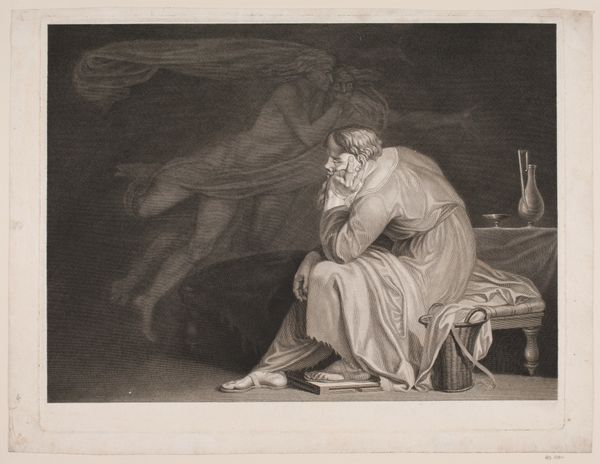 Editor: So, this print is called "Sokrates," made by J.F. Clemens in 1786. It's quite striking—almost theatrical—in its use of light and shadow. There’s this very solid, almost slumped figure of Socrates, but behind him, these ethereal figures. How do you interpret the symbolism in this work? Curator: The emotional weight of this piece lies precisely in the contrast between the corporeal and the spectral. Socrates is physically present, yet seemingly haunted or inspired by ideas that take the form of these ghostly figures. What do these figures represent, would you say? Are they simply figments of his imagination, or do they carry a more significant cultural charge? Editor: Perhaps they represent his daimon—his inner voice? Curator: Precisely! That’s an excellent reading. The daimon was Socrates’ constant companion, his source of ethical and moral guidance, manifested as inner promptings. Consider, too, how Clemens renders them in this Neoclassical style. It consciously echoes the artistic ideals of ancient Greece—an attempt to visually connect with a specific historical narrative, grounding the intellectual in something tangible. Are there visual cues, would you say, that establish Socrates as a figure separate from those around him, yet reliant on their ethereal presences? Editor: Well, his dress and position definitely suggest he is of importance and is alone; even more obvious given the other two individuals are floating behind him and nearly transparent. They almost seem to guide him, so I imagine he cannot ignore the symbols that represent the voice in his head. Curator: He’s isolated, yes, and framed against this nebulous presence that fuels his internal debates. This interplay highlights the struggle between the individual and the transcendent—a core theme of Socrates’ philosophy and therefore depicted via the work's symbolism. This image isn’t simply a portrait; it is a dramatization of internal and intellectual struggle. Do you feel the visual tension helps to connect the man and the idea in a complementary dance, so to speak? Editor: Definitely! I didn’t consider the deeper symbolism initially. Seeing the figures as representations of inner thought makes it far more compelling than just a historical portrait. Curator: And that’s where images truly speak. They connect us not just to historical figures, but to their internal lives, visualized through a language of enduring symbols.