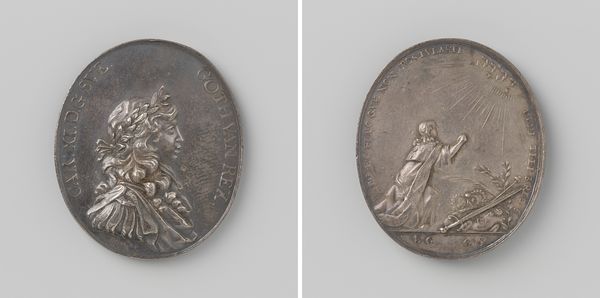 Editor: Here we have Johann Lorenz Natter’s 1751 bronze medal, "Overlijden van Willem IV," or "The Death of Willem IV." It's fascinating to see such a somber moment captured on what's essentially a coin. What can you tell me about the historical context of this piece? Curator: Well, the death of Willem IV was a significant event in Dutch history, marking a shift in political power. Commemorative medals like this served as important tools for shaping public memory and constructing narratives around leadership. Note how the medal likely functioned within a specific political landscape, intending to reinforce specific views and allegiances to the Oranje lineage. Editor: I see… So the choice of imagery – the portrait, the allegorical figure on the reverse – would be carefully considered for its impact? Curator: Precisely! Consider the stylistic choices. It aligns with Neoclassicism, but does it embrace the aesthetics fully, or does it serve a particular political message? The controlled style, and classical allusions serve to reinforce concepts of stability and legitimacy amidst transition, which speaks volumes. What impression do you get from that allegorical female figure with a lion at her feet? Editor: It gives me the impression of the Dutch Republic in mourning, a bit of a national symbol there with the lion. Curator: Indeed. The circulation of such medals shaped public perception in a powerful way. Understanding the function of this type of portrait, or symbol in political discourse helps decode the imagery. Did the medal succeed in conveying its intended message, or was there dissent regarding this representation? Editor: That makes me wonder how such official art was received by different social classes at the time. Food for thought. Curator: Exactly! It reminds us to look at art beyond its aesthetic value and consider the social and political forces that shaped its creation and reception. Editor: I'll definitely keep that in mind moving forward.