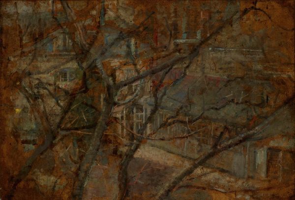 Frank Auerbach's "Behind Camden Town Station, summer evening" is a landscape rendered not through conventional representation, but through a dense layering of oil paint. The impasto surface creates a tactile quality, almost as if the scene has been sculpted rather than painted. Auerbach’s method involves building up thick textures over time, scraping away and reapplying paint. This process reflects a struggle to capture not just the appearance of a scene, but its very essence. The buildings and structures, rendered in reddish hues and deep blues, appear to emerge from and recede into a field of ochre, challenging our perception of space. Auerbach engages with a dialogue between abstraction and figuration. The subject is discernible, yet the forms are broken down and reformed through the materiality of the paint itself. This approach invites us to consider how the physical properties of art can challenge fixed meanings and allow for a more profound engagement with the world around us. Each viewing offers a renewed interpretation.