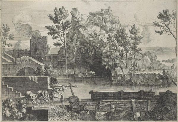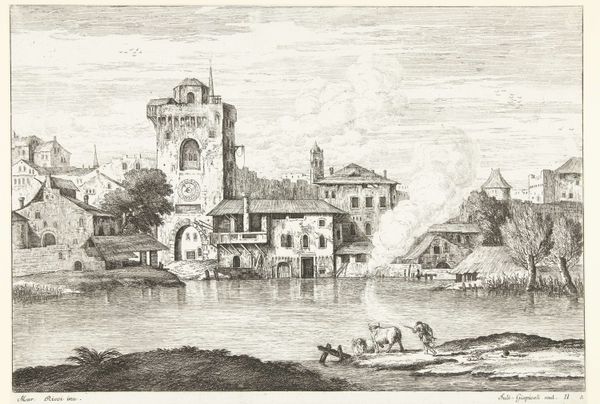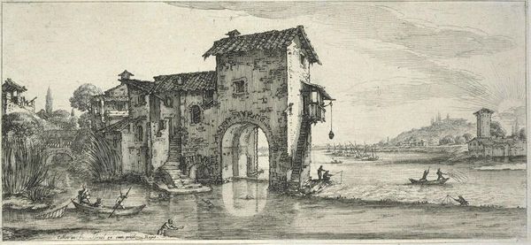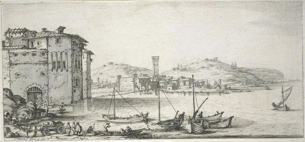 Editor: So, this is Jacques Callot's "River Boats with Passengers," a print residing here at the Harvard Art Museums. There's so much detail packed into such a small space; it feels like a bustling scene from another time. What's your read on it? Curator: Callot's prints, like this one, were incredibly popular because they offered a glimpse into contemporary life, but also helped shape perceptions of specific places. Notice how the architecture is presented alongside the river traffic and daily activities. Who was this imagery intended for, and how might it have influenced their understanding of river life in 17th-century Europe? Editor: That's a great point. It makes me wonder about the power of art to not just reflect, but also construct a reality. Curator: Exactly. And it's a good reminder to always consider the social context surrounding the creation and reception of art.
