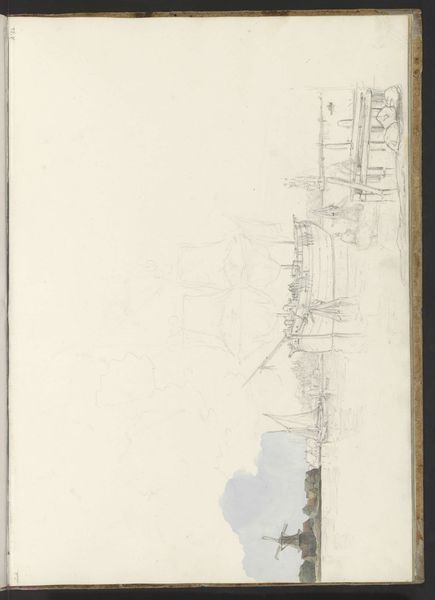 Editor: Here we have "Zeilschip," a drawing of a sailing ship by Johannes Christiaan Schotel, dating sometime between 1797 and 1838. It's graphite on paper, and there's something very sparse about the image. The ship itself is quite detailed, but it’s just a fragment, almost ghostly against all that white space. What do you see when you look at it? Curator: Well, I'm immediately drawn to the labor involved. Think of the timber that was felled, shaped, and transported, and the skill needed to construct such a vessel. Even in this preparatory sketch, Schotel reveals the materiality of maritime commerce. Editor: A preparatory sketch? Is this a study for a larger piece then? Curator: Possibly. Look at the line work—economic, yet descriptive. He's not just depicting a ship, but capturing the physical reality of shipbuilding. Consider, too, the social context: Holland was a major maritime power. These ships weren’t just pretty pictures; they were crucial to trade, colonization, and military strength. Editor: So, it’s not just the artistic process, but also the historical process that makes it significant? Curator: Precisely! And don’t forget the paper itself. Where did that come from? The linen rags, the labor of pulping and pressing. Everything in this image speaks to a chain of production. We should think about who profited from both the construction and the depiction of this ship, and what that tells us about power dynamics at the time. Editor: I hadn’t considered that the paper had its own story to tell! This definitely sheds a new light on the drawing beyond just the representation of the ship. Curator: Exactly, by looking at the materiality, the drawing starts telling richer and unexpected stories.