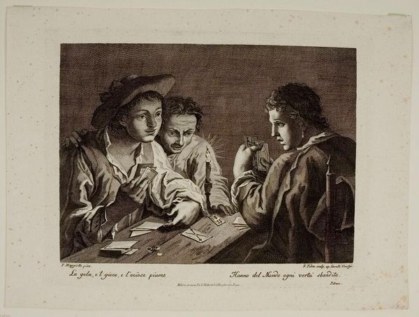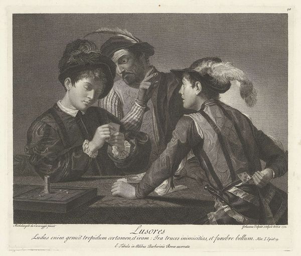 Editor: This is "The Cardsharps" by Giovanni Volpato. The way the figures are arranged around the table creates a palpable tension. What compositional elements stand out to you? Curator: The dramatic chiaroscuro, achieved through meticulous engraving, defines the characters. Observe how Volpato modulates light and shadow to accentuate the deceptive glances and furtive gestures. Editor: So the contrast emphasizes the deceitful nature of the scene? Curator: Precisely. The strategic placement of light not only illuminates the narrative but also underscores the moral implications embedded within the image's structure. Light reveals deception. Editor: I see how the formal elements are crucial to understanding the narrative. Curator: Indeed.