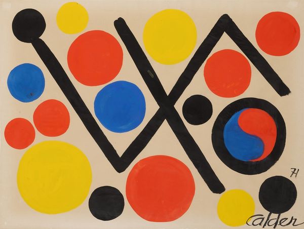 Alexander Liberman made this painting, Omicron VII, with shapes that feel both precise and playful. Look at the color choices—red, yellow, and blue, right? It’s like he's thinking about the basics, but also setting up a kind of optical game. The surface of the painting seems smooth, like he’s hiding the process. But I bet there were many layers and decisions to get those colors so bold and those edges so clean. See how the black circles sit inside the colored ones? They almost float. This hard-edged style makes me think of other artists, like Ellsworth Kelly, who also played with simple forms to create powerful visual experiences. It's a reminder that art doesn't always have to be complicated to be interesting. Sometimes, it's about seeing what you can do with just a few simple moves.