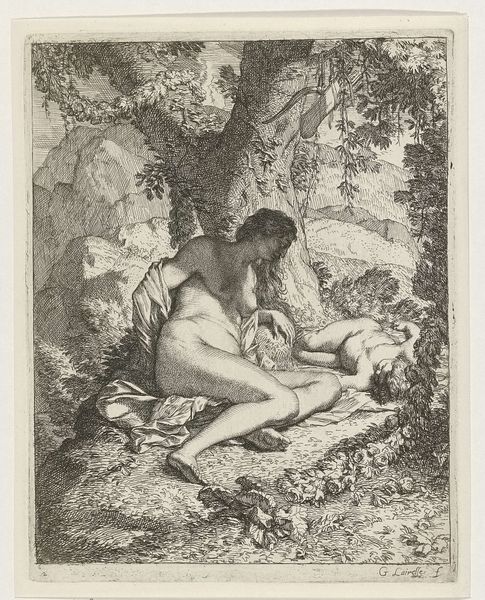 Curator: This is Gérard de Lairesse's etching, "Earth," held here at the Harvard Art Museums. Editor: There's a softness to it despite the medium. It almost feels like a dream, a quiet, fertile moment. Curator: It's an allegorical piece, likely intended as part of a series representing the four elements. Lairesse was very interested in classical antiquity. Editor: Right. And the sensuality, the reclining nude, that's straight out of classical tropes used to perpetuate patriarchal narratives. Curator: That's certainly a reading. The earth provides, nurtures… it's a very maternal, even vulnerable image, though, which complicates those narratives. Editor: I do agree, and it also speaks to the symbolic power of land and nature that continues today. Curator: An interesting consideration. Thank you for sharing. Editor: Thank you, that was insightful.
