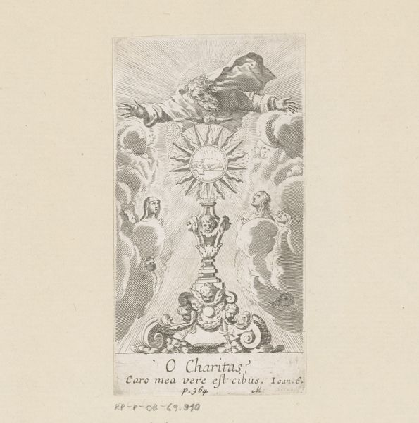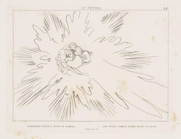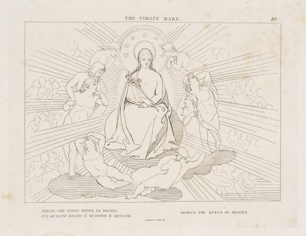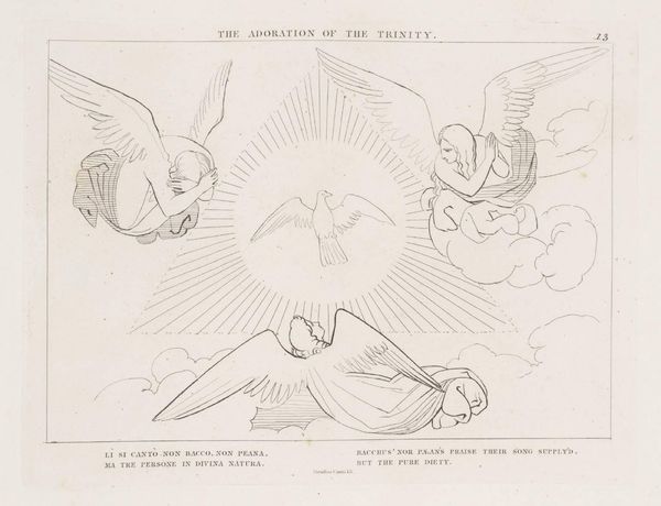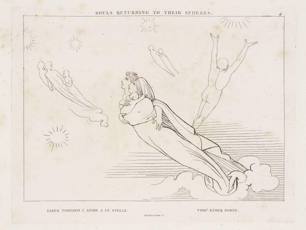 Editor: This is John Flaxman's "Heavenly Splendors." It's in the Tate collection, rendered in ink, I believe. The figures almost seem to be emerging from the stark white background. What strikes you about its composition? Curator: The linear precision and stark contrast create a powerful sense of idealized form. Consider how Flaxman employs line to define volume and space. The arrangement of figures, seemingly weightless, points to a carefully constructed geometry. Note, also, the radiating lines. What purpose do they serve? Editor: They unify the groupings, suggesting a divine light, perhaps? It’s interesting how such simple lines can evoke so much. Curator: Precisely. The formal elements—line, composition, and light—establish the artwork's symbolic content and emotional tenor. It invites contemplation on the sublime. Editor: I never thought about it that way, focusing on the interplay of form and meaning. Thanks!