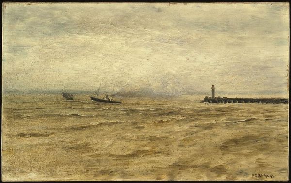 This is one of Claude Monet’s seascapes, in which horizon and cloud are rendered through form and colour. Here, the dominant horizontal bands of ochre and grey in the sky, pale turquoise sea, and purple horizon create an immediate sense of calmness and tranquility. Notice how Monet captures the water's surface with short, broken brushstrokes. This technique mimics the way light flickers across the waves, giving the sea a sense of movement and depth. The boats, sparsely distributed, interrupt the horizontality, acting almost like musical notes on a staff. The painting reflects a shift in artistic focus towards capturing fleeting moments and subjective experience. It’s about the sensation of being there, rather than a precise depiction. The dissolution of form serves a larger purpose: it challenges our conventional ways of seeing, asking us to find meaning not in detail, but in the overall sensory experience.