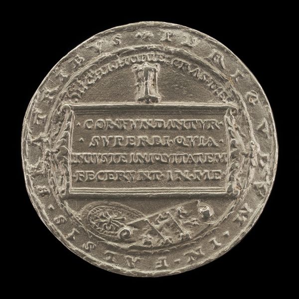 Jacques Jonghelinck created this Memento Mori medallion in 1571. Cast in bronze, its circular form is immediately striking, framed by a beaded edge that draws the eye inward to the intricate scene. The surface is dominated by a carefully arranged tableau of symbolic objects set on a table. The composition is structured by the juxtaposition of elements associated with life and death: a burning candle sits beside an hourglass and an open book inscribed with text. Jonghelinck meticulously detailed the textures and forms, from the smooth wax of the candle to the crisp edges of the book. This attention to detail invites viewers to contemplate the transient nature of existence. The Latin inscription, 'Mortalium Vigilia,' translates to 'Vigil of Mortals,' reinforcing the medallion's purpose as a reminder of mortality. This medallion functions not just as a symbolic artwork but also as a philosophical prompt, urging viewers to reflect on their own lives and the inevitable passage of time.