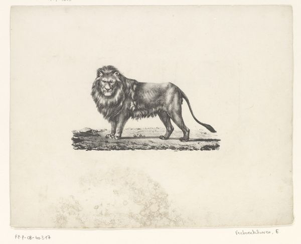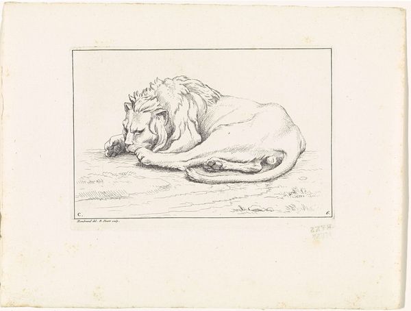 Editor: This is "Leeuw," a pen and ink drawing completed in 1729 by Bernard Picart, currently residing in the Rijksmuseum. What immediately grabs me is the lion's pose—relaxed, but still exuding power. The artist's delicate lines seem to capture that duality perfectly. How would you interpret the artistic elements at play in this drawing? Curator: Indeed, the artistry is evident in the interplay of line and form. Observe how Picart utilizes the varying densities of his linework. In areas denoting shadow, we find hatching, cross-hatching, adding depth. Conversely, the lighter regions of the lion, representing plane changes, are delicately articulated using a thinner line. Editor: So, the texture comes from the controlled application of ink rather than the lion itself? Curator: Precisely. The manipulation of light and shadow by Picart emphasizes form. It's also an interesting approach when thinking of texture and representation. Note, too, how the blank space of the paper actively participates, creating highlights and a sense of volume without literal depiction. Do you see how that technique adds dimensionality? Editor: I do! It’s like he’s sculpted the image with the ink. Also, considering it is a drawing of a lion, the frame appears unusually small. Curator: Good eye! The frame seems to compress the composition; does this affect the reading of the piece? Is the boundary there to isolate the subject, perhaps highlighting its ‘otherness’? It seems worth considering... Editor: It's fascinating to consider how the drawing is made up of simple lines. I also find your explanation about light manipulation and compression very insightful, because those were never obvious to me when I first encountered it. Curator: Likewise, contemplating the subtle intricacies within Picart’s "Leeuw" provides, in turn, new perspectives to interpreting formal decisions of this baroque work.
