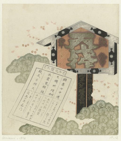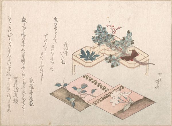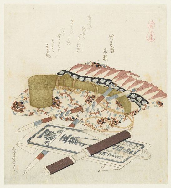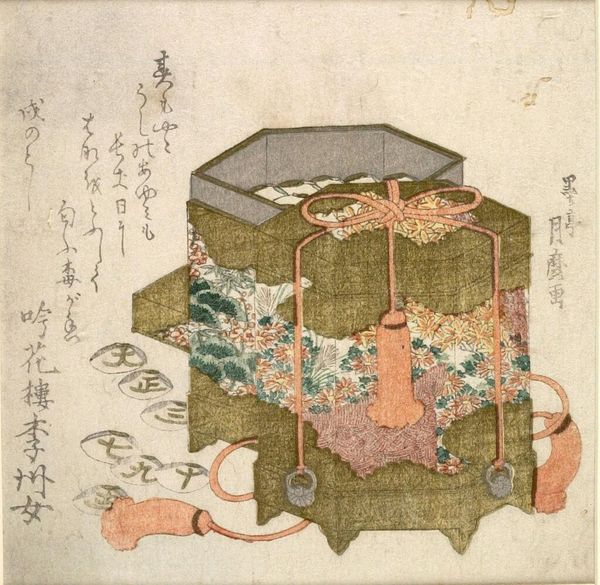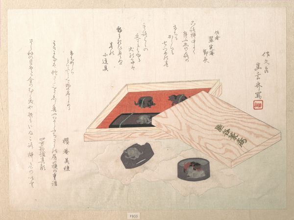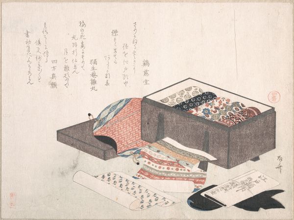 Editor: So, this is Hokusai's "Zeepaardjes" from 1822, a woodblock print held at the Rijksmuseum. It features what looks like opened containers, with cloud-like patterns. There's something both intricate and slightly odd about the perspective... What strikes you most when you look at this print? Curator: I see a fascinating reflection of the late Edo period's fascination with visual culture and mercantile practices. The detailed patterns suggest high craftsmanship, implying that these containers, likely for cosmetics or incense, were aimed at a wealthy clientele. It's less about accurate representation, more about evoking a sense of luxury and status. Why do you think Hokusai chose this specific subject? Editor: Well, perhaps it reflects the ukiyo-e tradition, capturing everyday life, but with an elevated aesthetic. I mean, it seems more complex than just representing 'everyday life,' as the multiple patterns seem a little busy. It looks as if there is a story to read here from these containers. Curator: Exactly. Think about how Japanese society was structured back then: Merchants were rising in power, challenging the old feudal order. Art like this became a vehicle for these new elites to assert their identity. Do you think displaying luxury goods, even through art, had a political dimension? Editor: That’s a very good point! By commissioning art celebrating commodities, the patrons were perhaps subverting traditional artistic norms which focused on landscapes or legendary events involving emperors, gods, and mythological creatures. I will now definitely explore the role of consumerism in Edo period art! Curator: I think you are absolutely right! I am now seeing new possibilities to analyse ukiyo-e art as a way of challenging authority, which also helped me see that images have profound social and cultural significance.