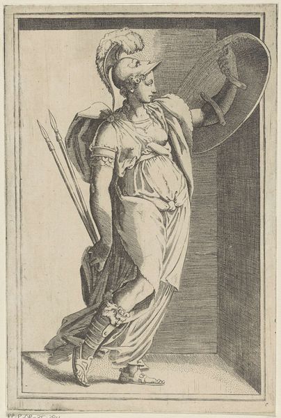 Curator: This is François Verdier's rendering of Saint Anatolia, currently residing in the Harvard Art Museums. I'm immediately struck by the composition. It has a luminous, almost ethereal quality, don’t you think? Editor: Curator: Absolutely. Verdier's masterful use of light and shadow lends itself to that effect. The lines, the materiality, they guide your eye to the focal point: Saint Anatolia and the sword. What do you think she's looking at? Editor: Maybe a vision. Or perhaps she's calling upon a higher power. I like how her stance suggests a delicate balance between vulnerability and strength. Curator: Her narrative, as the one who heals, really resonates with the drawing's composition and Verdier's delicate strokes. The city on the water in the background only enhances the drama. Editor: Indeed. I walk away feeling I've witnessed a moment of profound personal revelation, subtly rendered. Curator: Precisely, and that's the enduring power of Verdier’s Saint Anatolia.