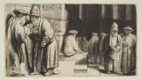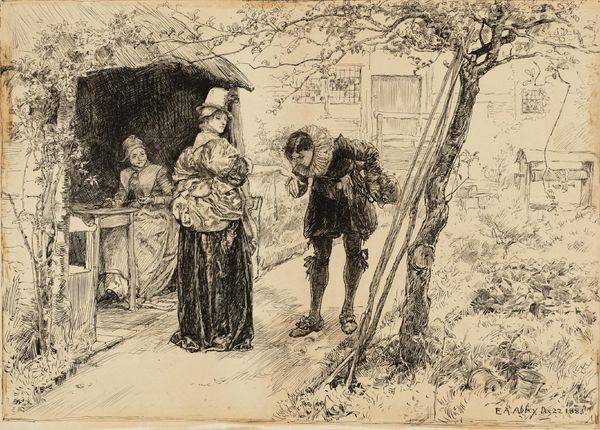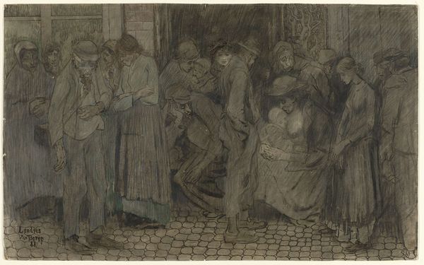 Curator: This is Peder Severin Krøyer's "Morning at Hornbæk. Men and women bargaining," painted around 1875. It’s an oil painting depicting a bustling scene at the Danish fishing village of Hornbæk. Editor: Ah, it has that beautifully unfinished quality! It's all very dreamlike, like a half-remembered moment washed in coastal light. Sort of fleeting. Curator: Precisely! Hornbæk was known for its vibrant fishing community, and Krøyer captures the early morning activity around the day's catch. This would have been a vital economic and social hub. Editor: Those unfinished sketches to the left…almost ghostly figures watching from the sidelines! What do they signify, some phantom of failed negotiation perhaps? It makes me consider what kind of power dynamics exist here. Curator: An excellent point. The act of bargaining itself is a loaded ritual. Observe how the women huddle together, perhaps forming a united front. Editor: The colours tell their own tale, too. Predominantly muted, humble shades of blue and brown. They seem anchored to the earth. Honest colours that suggest real, arduous work. Is it about authenticity or lack thereof? I always wonder when looking at an artwork! Curator: In terms of iconographic weight, it is tempting to interpret these colours as symbolizing stability, community, reliability in an unstable market, especially within 19th-century Danish society facing its own economic upheavals. Editor: Despite all of that serious interpretation, what lingers most is a quiet, melancholic charm. It's the gentle reminder that life’s transactions – from fish to friendship – all play out under the watchful eye of time and circumstance. Curator: It's a poignant perspective—Krøyer doesn't shy away from representing how the mundane interactions contribute to a grander historical picture. Editor: He does make it seem pretty simple. This slice-of-life captured forever like a faded, pleasant postcard.