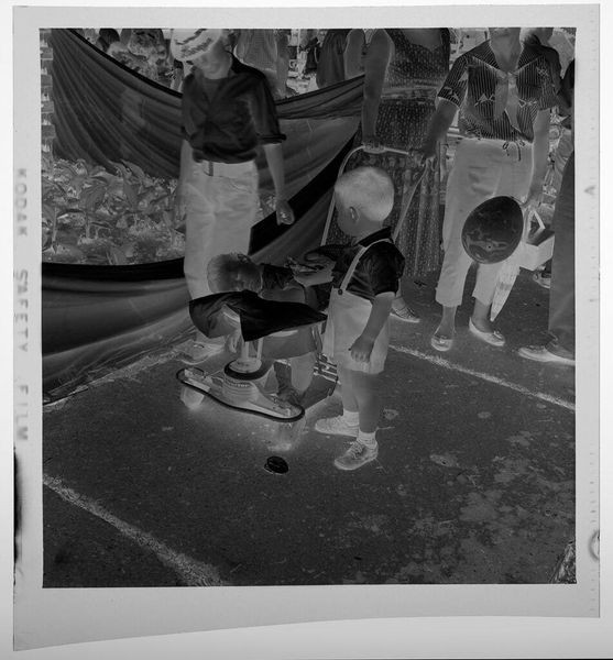 Editor: This small, undated photograph by Jack Gould, titled "Untitled (crowd at outdoor picnic, small boy and baby in front)," captures a moment at what seems to be a public gathering. It feels intimate, yet distant, and the negative tones create a strange effect. What can you tell me about it? Curator: I see a fascinating study in the materiality of photography itself. Note the Kodak safety film markings. This highlights not just the image, but the means of its production and circulation. Who was this photo for, and what social function did such a document serve? Editor: That's a great point, I hadn't considered the photograph as an object in itself. I was too focused on the people. Curator: Exactly! Think about the labor involved, from film production to the photographer's choices. It’s a window into a specific time and technology. Editor: So, it’s not just a snapshot, but a manufactured object embedded in a broader system. Thanks for highlighting that!