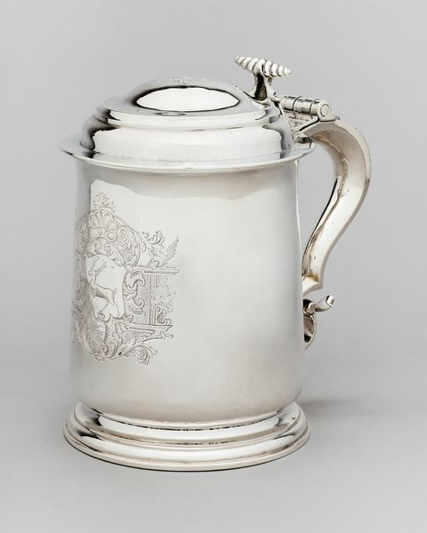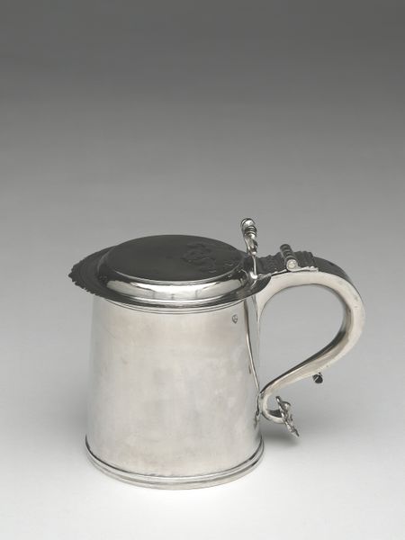 Editor: This silver mug, crafted by John Bodington, has a certain elegance, doesn't it? The reflective surface and simple form are quite striking. What do you make of its composition? Curator: Indeed. Note the interplay of cylindrical volumes, articulated by linear bands. The handle, a robust curve, provides a counterpoint to the body. The way the light reflects off of the piece adds a layer of dimension, emphasizing its form. Does the form itself suggest anything further? Editor: It seems very functional and almost timeless. I hadn't really thought about the light. Curator: Precisely. Bodington's understanding of form and surface elevates a utilitarian object into a work of art. Editor: I'll certainly look at everyday objects differently now. Thanks! Curator: My pleasure. Observing the inherent beauty in functional design enriches our visual understanding.