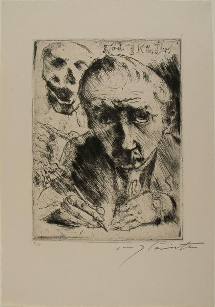 Curator: Looking at Kirchner’s "Portrait of Carl Sternheim," a lithograph from 1916 now residing at the Minneapolis Institute of Art, I'm immediately struck by the stark contrast and intensity of emotion it conveys. Editor: The harsh, almost brutal, lines give it such a sense of unease. It's unsettling, yet compelling. I keep wanting to look away, but something holds me captive. Curator: Those lines are incredibly symbolic in German Expressionism. Artists often used distorted features to depict inner turmoil. Here, the monochrome palette emphasizes Sternheim’s somber gaze and thoughtful pose. There's a certain darkness, wouldn’t you agree? Editor: Absolutely. Consider the historical context: 1916. World War I raged, profoundly impacting German society and art. The sense of disillusionment and psychological trauma permeates much of the Expressionist work produced during that period, shaping how we, even now, interpret it. This is more than just a likeness. Curator: Precisely. Kirchner saw Sternheim—a playwright—as part of an avant-garde artistic circle, a patron almost. This image becomes an icon then, for their cultural moment: the Weimar Republic, the cultural shift that marked modernity itself. Editor: But, as with all portraits, there's the power dynamic. Artist and sitter. Patron and creator. How much control did Sternheim have over his own image, his own representation for posterity, especially within this tumultuous era? The very act of creating a print – designed for circulation – places it firmly within the arena of public perception and potentially political discourse. Curator: And I’m sure those spiky, almost aggressive strokes felt revolutionary in the day; now, we know how much psychological weight Kirchner was able to load onto simple monochrome portraiture using these marks. The stark symbolism is very striking, don’t you agree? It becomes almost emblematic of the era’s anxiety and creative intensity. Editor: Thinking about how art reflects—and refracts—society is endlessly rewarding. Curator: Absolutely, providing insight through symbolic representations of internal struggles.