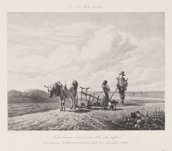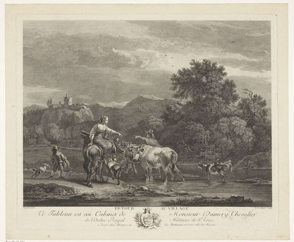François Godefroy created this print titled "The Fresh Morning," dedicating it to Monsieur Vassal de St. Huberti, during a time of rigid social hierarchies in France. The image offers us a glimpse into the pastoral, seemingly untouched by the political unrest simmering beneath the surface of 18th-century France. At first glance, it's an idyllic scene: animals herded across a landscape, figures on horseback, and rolling hills. But consider the context: Godefroy dedicating this to a member of the aristocracy even as revolution brewed. How does the image, and its dedication, function as an artifact of class and power? The “fresh morning” perhaps symbolizes a desire for renewal, yet it's presented through the lens of an elite class, seemingly removed from the realities of the common people. It invites us to reflect on whose stories are told, and whose are left out, during times of great upheaval. The emotional pull of pastoral imagery is undeniable, but it's crucial to question what that imagery obscures.