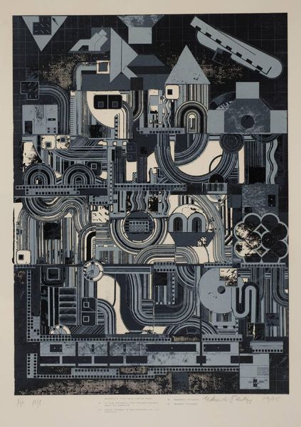 Curator: Immediately, I see a dense, almost overwhelming array of lines and shapes. It’s quite striking. Editor: We're looking at "Appel-Calder" by Sir Eduardo Paolozzi. The piece employs many layers of screenprint to create this visual experience. Curator: Screenprinting, yes. It feels almost like a blueprint or some kind of circuit board, hinting at technology and its structures. The way Paolozzi worked with repetitive forms makes me think about mass production. Editor: Paolozzi challenged the divide between high art and the everyday, using the language of mass media to reflect on post-war society. This piece does remind us how technology and consumerism shape our identities. Curator: Precisely. There's a critical commentary embedded in the work, it seems to suggest the way we navigate the modern world. He definitely questions societal norms. Editor: I appreciate that Paolozzi invites us to consider the physical process of image-making, making us wonder about the cultural implications. Curator: Agreed. The multiple layers reveal something of our own complex layers of identity.