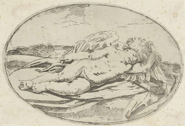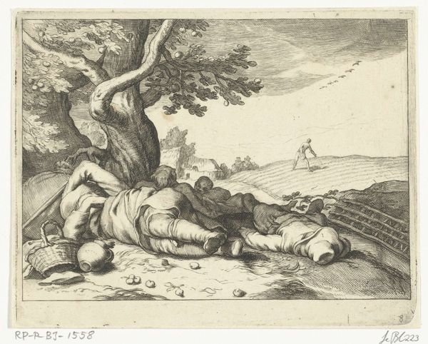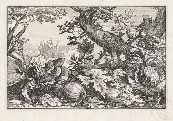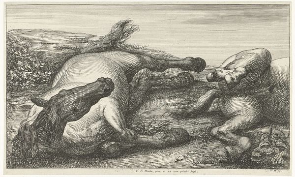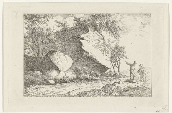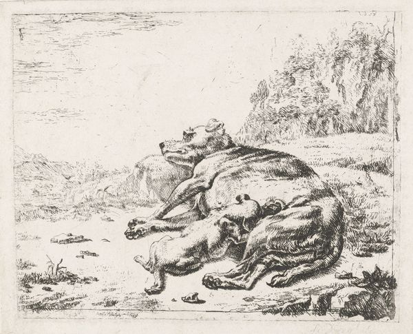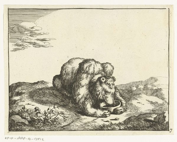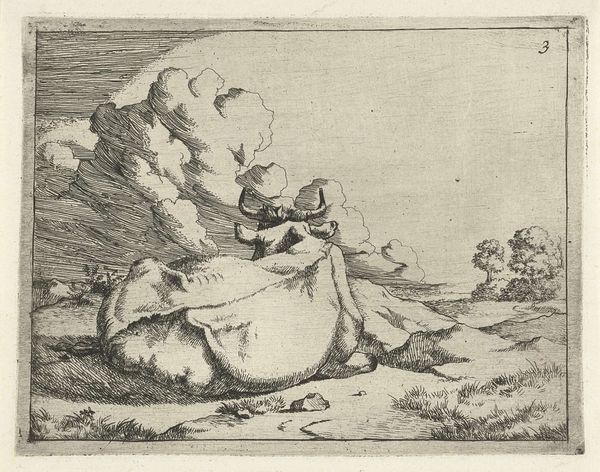 Editor: So, we're looking at "Bok zittend bij omgevallen boom" - that's "Goat sitting by a fallen tree," around 1657-1761, an etching by Marcus de Bye here at the Rijksmuseum. It's this incredibly detailed image of a goat looking very majestic amidst a pastoral setting. It feels strangely…melancholic, actually. What do you make of it? Curator: Melancholy…I like that! You know, to me, it whispers of a forgotten fable, doesn’t it? Like Aesop decided to dabble in existentialism. Look at the goat, enthroned on this little rise; utterly unbothered. Perhaps it's a quiet meditation on the fleeting nature of power - the fallen tree representing a king or empire brought low by time. Or maybe I'm just projecting my own Tuesday afternoon onto a seventeenth-century etching. What do *you* see in that landscape? Does it offer any clues? Editor: The landscape...it feels both detailed and sparse. Like there’s a whole world hinted at, but it's all simplified, distant. And the etching style…it makes everything look older, more…I don't know, symbolic? Curator: Exactly! Think about the Baroque period, its love of dramatic contrast, its fascination with the ephemeral. De Bye uses the etching technique beautifully – those fine lines, almost like whispers on the page – to evoke this sense of transience. Is the goat contemplating the fallen tree, or the future that awaits *him*? Is he king of his own little existential kingdom? It’s all so delightfully ambiguous! Editor: So, it’s less a straightforward landscape and more like… a stage for contemplation. A kind of philosophical theater with a goat as the lead? Curator: Precisely! And sometimes, dear student, a goat is so much more than *just* a goat. Editor: This has completely changed how I see it. It’s like the artwork woke up from a nap. Curator: Absolutely. And that’s the magic, isn’t it? Each time we look, it tells us a new story.
