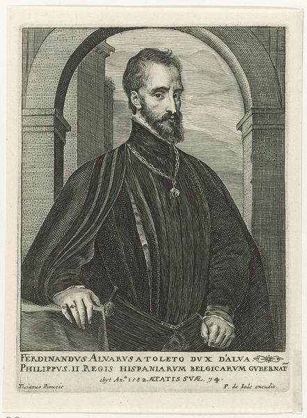 Petrus Clouwet created this portrait of Hendrik Zoesius as an engraving, a printmaking technique using fine lines to create a detailed image. The composition is carefully structured around the sitter, who occupies the center, framed by a backdrop of books and draped fabric. Look how Clouwet used the linear quality of engraving to define textures, from the ruffles of the collar to the patterns in Zoesius's robe. This is achieved through dense networks of lines, hatching and cross-hatching, creating a contrast between light and shadow that defines form. The formal elements of the portrait—the precise lines, the considered arrangement of objects, and the textual inscriptions—reveal a preoccupation with representation and identity. The portrait’s lines and forms communicate power and knowledge while revealing Zoesius's status and intellectual character. Notice how the detailed lines of the engraving serve not just to depict but to construct meaning, a testament to the power of form in conveying cultural and philosophical ideas.