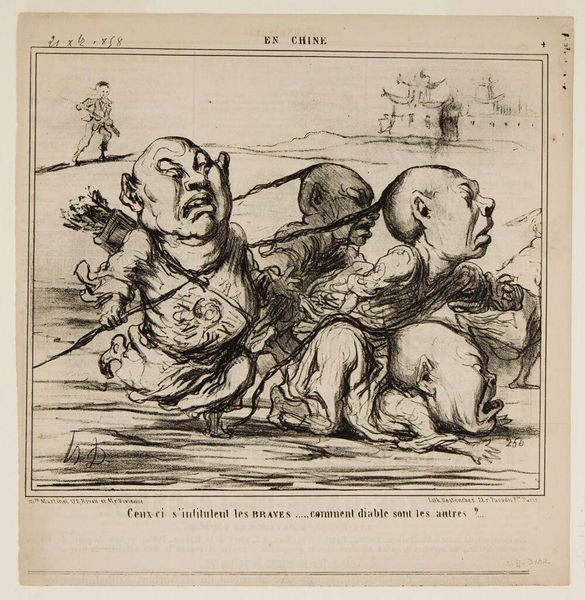 Curator: Let's explore Honoré Daumier's lithograph, "Christ! the beautiful sorrel plant!" at the Harvard Art Museums. Editor: My first impression is a feeling of unsettling unease, the disproportionate figures rendered with harsh, almost grotesque lines. Curator: Indeed. Note how the exaggerated features satirize Western perceptions of China. The figure on the right, under the imagined Chinese plant, embodies the caricatured stereotype, a commentary on colonial attitudes. Editor: The sharp contrast in light and shadow, achieved through dense crosshatching, heightens the drama. The composition, with the two figures isolated, almost confrontational, adds to the tension. Curator: Daumier uses the visual language of caricature to critique the political climate. The sorrel plant, likely symbolic, could be linked to exploitation or exoticism. Editor: It's fascinating how Daumier uses these formal elements to convey such a potent message about cultural misunderstanding. Curator: Precisely. The image reverberates with uncomfortable questions about how we view other cultures.
