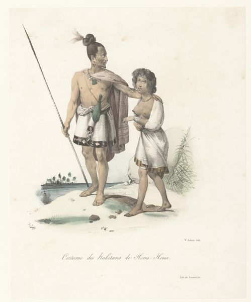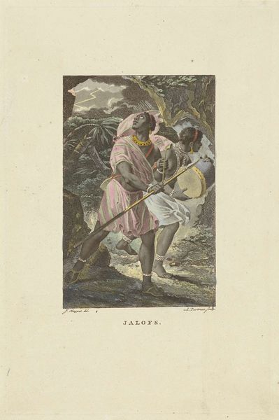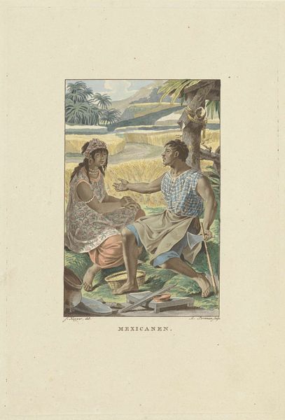 This image shows a work by Ludwig Gottlieb Portman, a depiction of a Naudowessie man and woman. The print uses soft, muted colors and detailed line work to create an image that is both ethnographic and aesthetic. The composition is structured by the interaction between the two figures, who are positioned against a backdrop of lush, yet indistinct, vegetation. The man, on the left, gestures with an item in hand; the woman, mirroring his pose, stands slightly behind. Portman's use of line and shading defines the figures' musculature and attire, emphasizing an idealized naturalism. The background blurs into abstraction, serving mainly to frame the subjects. This print reflects broader European interests in categorizing and understanding different cultures through visual representation. Note how Portman's careful arrangement and detailed rendering elevate the subjects, and the overall print is part of a visual discourse, reflecting the power dynamics inherent in the act of representation.