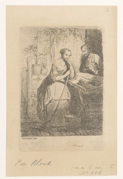 Editor: Here we have "Two Women at a Table" by Barbara Elisabeth van Houten, created sometime between 1872 and 1950. It seems to be a sketch, likely in pen and ink, maybe for a larger piece. The detail is striking, especially given the medium. What is your immediate impression of the visual language? Curator: The success of this image resides within its contrasting textures, specifically, its remarkable tonal range produced with minimal cross-hatching. How the artist varies line weight within the depiction of domestic life produces not just form, but feeling. Notice the relative density within the girl's seated posture compared to the sparse background. Do you notice how that contrast produces depth, almost architecturally? Editor: Yes, definitely! The girl really pops out, and I see how the lighter sketchwork around her almost creates a halo effect, or pushes her forward. How does this inform the composition as a whole? Curator: Observe how the internal geometry creates a strong focal point at the center foreground, and how our eye is gently pulled throughout the picture frame. Notice, too, the orthogonals as they establish implied perspective within a primarily two-dimensional composition. Can we ascertain the narrative implications of this carefully orchestrated picture frame? Editor: It almost feels staged in a way, like a posed photograph. I hadn't considered how much intention goes into what appears at first glance like a candid sketch. Curator: Precisely. The power resides in the successful tension of conflicting readings, creating a sense of visual energy that remains unresolved, thus available. What is your final assessment? Editor: I will definitely think about sketching differently now and will also be focusing more on the light in images. It has been a revelation!