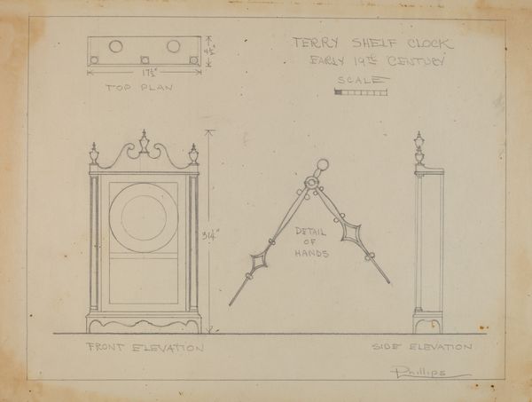 Lawrence Phillips made this drawing of a side chair, sometime in the 20th century, using ink on paper. It's a study of line, a blueprint for something to be made. The drawing presents the chair in three views, almost like a mechanical rendering. But the lines aren't perfect; they waver and thicken, giving the piece a human touch. I find myself drawn to the legs of the chair in the main view, those bulbous forms stacked one on top of the other. There's a playful quality to their repetition, an almost cartoonish exaggeration of classical form. The lines create a sense of depth, of the chair existing in space, but the overall flatness of the image reminds me that it’s just a representation. This piece reminds me of some of David Hockney’s early graphic works, where line is used to describe form and space in an almost diagrammatic way. There's a tension between the utilitarian function of the drawing and its inherent artistic qualities. Ultimately, it's this ambiguity that makes the piece so compelling.