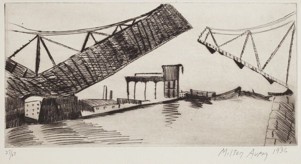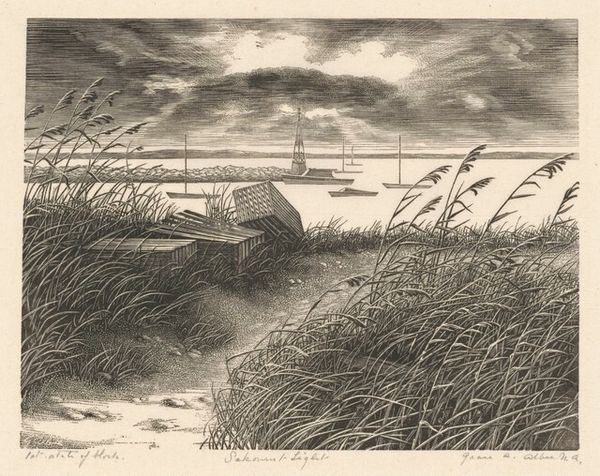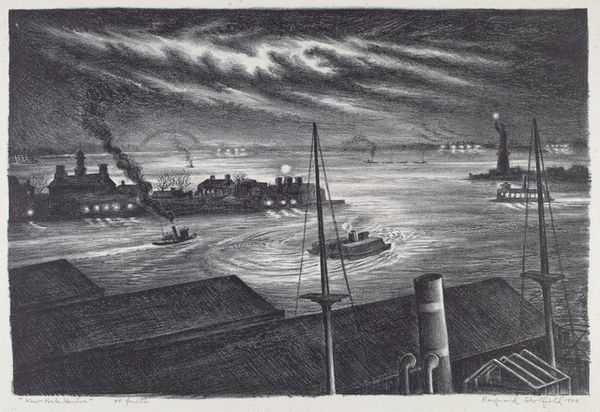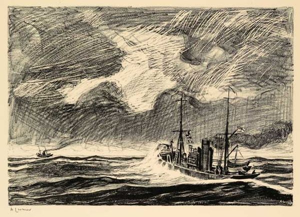 "Amphibious Training" is a drawing by Michael Remus, an artist who lived through a tumultuous period in history, from 1880 to 1999. This artwork seems to capture a moment of intense preparation, possibly for military action. The somber sky and the focused activity on the pier evoke a sense of anticipation, of collective purpose. The artist’s careful attention to detail – the texture of the clouds, the structure of the cranes, and the figures in the boats – invite us to consider the human element within this grand scene of mobilization. The artwork also carries themes of labor, industry, and the role of individuals within larger systems. This piece is a complex reflection on humanity's relationship to progress, conflict, and the natural world. It prompts us to consider how these elements intersect to shape our experiences and identities.