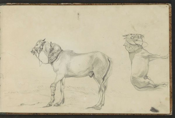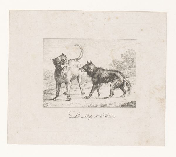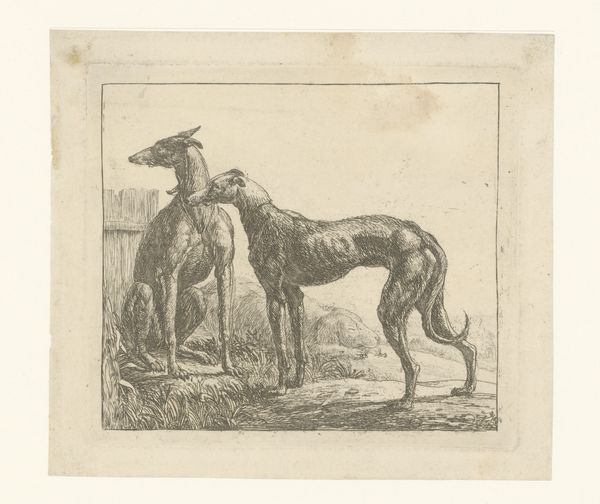 Curator: Here we have "To hunde," or "Two Dogs," a print created in 1831 by Oluf Olufsen Bagge, rendered with pencil and other drawing techniques. Editor: A stark and rather whimsical piece. The lines, though simple, possess a certain clarity, but also… the dog to the right seems to be making some kind of gesture, maybe howling. Curator: The image functions through its balanced distribution of tonal values. Notice the use of hatching to articulate form, contrasting light and shadow on each dog. Editor: It definitely has a classical echo to it; the upright posture reminds me of classical sculptures of dogs. Beyond that, I wonder what is suggested by the contrasting demeanors: one dog standing almost as a pillar looking up, one cowering to its side looking rather pitiful. Curator: The realism certainly hints toward a scientific sensibility too, a study of canine anatomy. Notice how the artist carefully delineates muscle and bone. It’s an observation, not just a depiction. Editor: Absolutely, yet it’s hard to separate that anatomical exactness from symbolic undertones. The raised head often symbolizes vigilance, spirituality, maybe even freedom, whereas the other feels chained and dejected. Maybe these animals were actually supposed to suggest moral polarities. Curator: An interesting angle. I concede it's not *merely* a straightforward recording. I suggest that one need not impose allegorical narrative. Is there, perhaps, potential here for the reading of a deconstruction, a dialectic? Editor: Even if unintended, that potential does live in the juxtaposition itself; the tension and balance invite narratives, and our human perception compels us to invent one. The material fact of paper and pencil transforms here into something brimming with interpretation. Curator: Very well, and, taken in sum, Bagge offers us a very well-observed and structured exercise in pictorial analysis that does carry certain evocative qualities. Editor: Indeed. Thank you. It is remarkable how what seems on the surface like an observational illustration, in effect becomes an invitation to contemplate themes that are, dare I say, innately and eternally human.