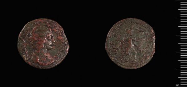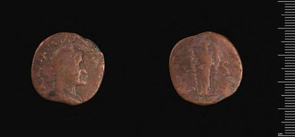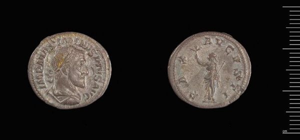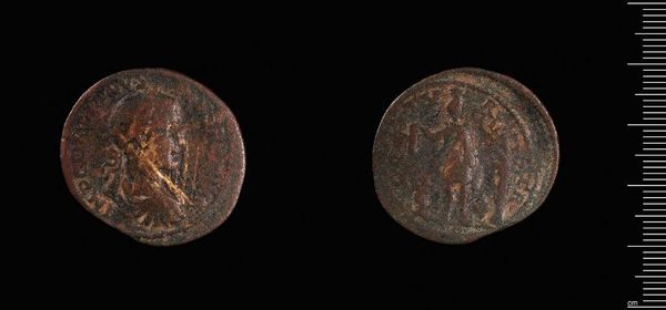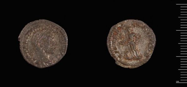 Curator: We're looking at an Antoninianus, a Roman coin, minted under the rule of Gordian III. Editor: It's surprisingly delicate, even in its worn state. The low relief almost blends into the metal itself. Curator: Precisely, the coin’s imagery functions as potent propaganda; Gordian’s portrait connects him to power and divinity. Editor: The artist employed a restricted palette, but the circular format and subtle detailing create a powerful impression of authority. Curator: And the figure on the reverse, likely a deity, reinforces the ruler’s connection to the divine order. It’s designed to convey stability. Editor: The composition and the artist's rendering of depth, however subtly, give it an illusion of grand scale. Curator: It reminds us that symbols persist far beyond their creators. Editor: Indeed, a small object speaking volumes across centuries.