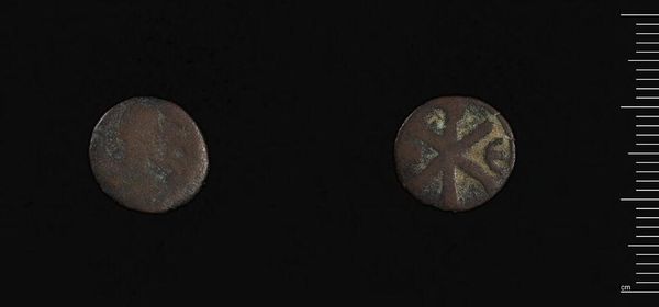 Curator: This artifact is a coin from Antioch, issued during the reign of Elagabalus. The weight is 3.85 grams. Editor: The degradation of the metal gives it a sombre feel, a stark reminder of the emperor's tumultuous and brief reign. Curator: Elagabalus's policies challenged Roman norms, particularly regarding religion and gender roles, making his rule a focal point for discussions on identity and power. Editor: Considering its manufacture, how were these coins produced and distributed? What materials did they use, and how did the minting process reflect the empire's labor practices? Curator: Absolutely. Elagabalus's reign highlights the importance of examining historical figures through an intersectional lens, acknowledging how identity, gender, and power intersect to influence historical events. Editor: These questions help connect ancient practices to modern understandings of labor, materiality, and economic exchange. Curator: Precisely.
