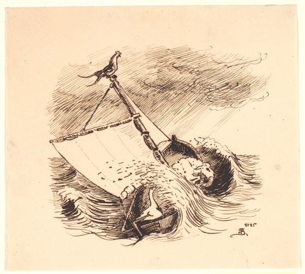 Curator: What strikes me immediately is how much we learn from Skovgaard's focus on line and its application on the page. It tells a story about illustration as both an art form and labor for artists at the time. Editor: I see Niels Skovgaard’s "Illustration til Dyrenes Sørejse samt blyantsrids" from 1925, rendered in ink and pencil on paper. There’s a small boat battling choppy waves. What can you tell me about it? Curator: Think about what "illustration" implied in 1925. This was work. Skovgaard wasn's simply creating “art,” he was producing a product within the social and economic context of the book trade, a system of material distribution. So, let's examine the visible layers. The visible, perhaps hurried, marks suggest a printing process. How do the rapid lines hint at Skovgaard's labour? Editor: It feels like he's capturing a scene quickly, like a journalist might sketch at the scene of an event, and the limited medium suggests perhaps it’s intended for quick reproduction? Curator: Exactly! We should also note that this wasn't intended as high art, so that opens questions. Was Skovgaard elevating a simple medium to something powerful? How might the accessibility of the medium of pen, ink, and readily available paper democratize art for both the creator and the consumer? Editor: So it's more about the artistic process and the materials available at the time that tell the story, and perhaps challenge this separation between fine art and craft. Curator: Precisely. It pushes us to think about the conditions of artistic creation and the artist's role in a broader social framework. Editor: This really highlights the material realities behind creating images for mass consumption and also how labor and cost shape our view of art! Curator: It certainly does. Seeing the artwork through the lens of its production gives you a fascinating new insight.