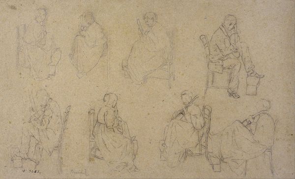 Curator: This is John Singer Sargent’s “Figure Studies of Horses, Children, and Women,” part of the collection here at the Harvard Art Museums. Editor: There’s an immediacy to this work. It’s like we're peering into the artist's sketchbook, seeing his raw, unfiltered thoughts take shape. Curator: Indeed. Sargent, known for his society portraits, often used sketches like these to explore form and composition. Note how his elite clientele and their accouterments are absent here, replaced by the mundane. Editor: The sketchiness speaks volumes about process. You see the artist grappling with line and form, focusing on the materiality of representation itself rather than polished illusionism. It foregrounds the labor. Curator: And it humanizes Sargent, doesn’t it? We see the artist working through ideas, unburdened by the expectations of the art market, allowing the drawings to reveal the artist's intimate process. Editor: Right, it’s a privileged view, disrupting the myth of effortless artistic genius by showing us the workings of art. These images show us how he made his art in the era's artistic and material culture. Curator: Seeing Sargent's sketches really changes how I understand the man and his work. Editor: It’s a reminder that even masters like Sargent were, at their core, artisans wrestling with materials and ideas.