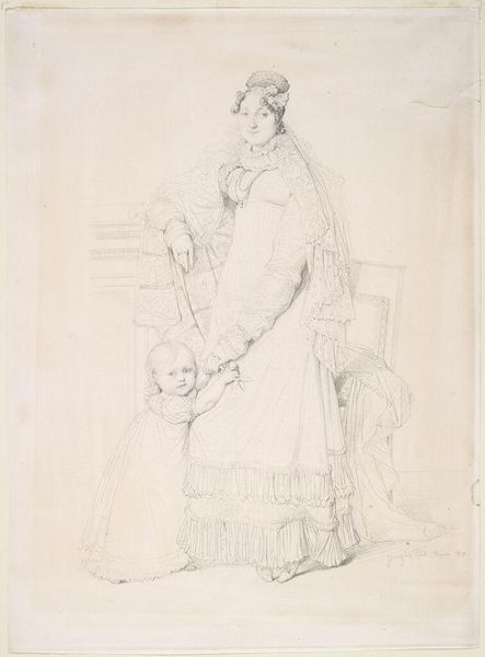 Curator: This pencil drawing, dating from around 1818 to 1848, presents a sculpted portrait of Isabelle Bureau de Beaumont. It reflects a clear engagement with neoclassical ideals and their relationship to academic art. Editor: There's a striking stillness. It almost feels like capturing a paused moment in a play – like right before or right after some heavy drama. I'm also intrigued by the lines; they're so delicate. Curator: That delicacy stems from its adherence to line drawing, emphasizing form and contour within the neoclassical framework. The depiction invites exploration of societal and gender roles embedded in its creation. Editor: Do you think it’s more than just that, though? I mean, sure, there’s the formal technique and everything, but it gives me a vibe of restrained longing or something. What do you make of that folded hands position, that specific expression of intense pleading, maybe a hint of controlled fear, you know? It transcends pure formalism. Curator: Well, placing the piece within a post-revolutionary context enables an expanded narrative, acknowledging how the formal choices also address historical events. Considering shifts in gender dynamics after the French Revolution gives depth. Editor: Revolution or not, being immortalized in stone kneeling forever? What a thought! Maybe it touches upon that unease. Makes you ponder power and representation, the stories we decide to preserve. Curator: Absolutely! Understanding those power dynamics within the artwork’s representation underscores a broader socio-political critique, prompting us to investigate further beyond merely its classical features. Editor: Agreed! Seeing it as simply beautiful hides so much under those graceful pencil strokes. Well, now I am really looking forward to contemplating other sculpted portraits of ladies from those days; it definitely altered how I feel about the piece! Curator: Indeed, shifting perspectives allow richer interactions that go far beyond surface assessments.