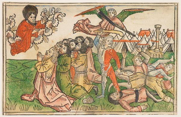 Curator: Looking at this piece, what immediately strikes you? Editor: It has an intensity born from stark color and line, hasn't it? A raw visual immediacy despite the obviously grave subject matter. Curator: That rawness aligns well with the medium. This is a woodcut, likely from around 1490, titled "Christ Nailed to the Cross," attributed to an anonymous artist of the Northern Renaissance. Woodcut prints, especially during this period, involved significant labor. Can you imagine the skill required to carve these details in relief on a block of wood? Editor: Absolutely. And we need to also consider who this labor actually benefitted, and who could access this image. This wasn't meant for some private collection, was it? Printmaking allowed wider dissemination of religious narratives to people, even illiterate ones, and often functioned as a crucial form of cultural and political education for marginalized populations. Curator: Indeed. The prints served as accessible conduits of the Church's messages and could even be tied into devotional practices. But even then, consider the price of pigment! The colored inks, though simple, reflect resources and skill investments to capture viewers' eyes. It raises questions about production value, as well as how these prints functioned commercially in a developing marketplace. Editor: Precisely. It also invites a complex, intersectional discussion. Notice the figures, the emotional states implied by their gestures. Consider how a peasant woman would experience such an image of torture, likely experiencing extreme violence and limited agency in her own life. How might that affect their interpretation of divine suffering versus that of, say, a merchant with ties to the very trade practices enriching some while impoverishing others? Curator: The contrast between Christ's passivity and the active violence inflicted upon him is compelling, isn't it? Thinking materially, I wonder if the specific tools used and the quality of paper affected the final impression intended. The linear nature of the woodcut aesthetic lends itself well to rendering pain and suffering—those dark lines cut so starkly into the image create drama on a technical level. Editor: Agreed. It's powerful because of its simplicity, the unvarnished portrayal. Even within this seemingly simple aesthetic, consider the layered complexity embedded in representing power, oppression, and resistance to violence in the artwork. I appreciate seeing this anonymous artwork today and having access to these important narratives, especially the way the use of print enabled the sharing of cultural history and visual narratives. Curator: Indeed, analyzing not just *what* the print depicts but also the materiality behind the *how* and *why* adds depth to our comprehension of this image, which also shapes an era's social narratives.