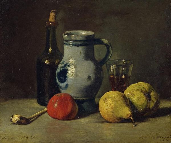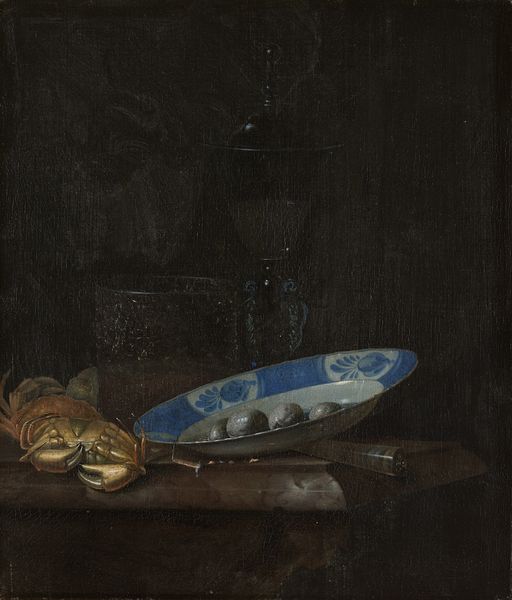 Curator: This oil painting, “Still Life with Oranges,” was completed around 1670 by Willem Kalf. You can currently find it hanging on display at the Städel Museum. What are your first impressions? Editor: Dark. Rich. Dramatic. Almost theatrical, really. The shadows feel like they are swallowing the objects, but the highlights on the fruit practically vibrate. The orange itself pops—it's the stage light here. Curator: Kalf was a master of Dutch Golden Age still life, really emphasizing luxury goods. Consider the sheen on that seashell, next to the glass goblets. There's also something distinctly Baroque in how he uses light and shadow to emphasize texture and volume. The Dutch really transformed the "banal" into things of significance through the symbols and metaphors present in the imagery of everyday objects. Editor: And the light isn't just about volume; it feels symbolic, illuminating the transience of beauty, right? These oranges, so vibrant now, will inevitably decay. The precariousness of that goblet seems deliberate, ready to tumble. But I'm especially intrigued by that blue-and-white bowl. I can feel that its iconography bridges both the orient and the occident in ways the artist may or may not have intended. Its design alludes to longer-standing notions of refinement, worldliness, even spirituality. Curator: That Chinese porcelain is absolutely central, literally and figuratively, speaking to the Dutch East India Company and global trade. Kalf often included exotic imported goods as a way to signify prosperity and refined taste. Dutch culture often mirrored itself through these possessions. It begs the question of how self-portraits took place through domestic spaces. Editor: Exactly, that's a potent signifier in itself. It’s not just a bowl, but a declaration of cultural capital. But what truly fascinates me is how the arrangement creates a dialogue, or even an argument, between earthly pleasures – the fruit, the wine – and a deeper, more spiritual longing for understanding and legacy. That quiet hum in all still lifes that somehow capture human anxieties so gracefully. Curator: Yes, a perfectly palatable collision of vanitas and mercantilism! Thanks for untangling those threads for us! Editor: Always a pleasure! Now I'm off to find an orange. And a history book...