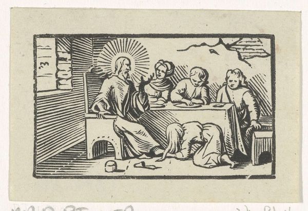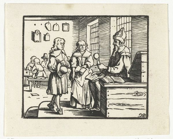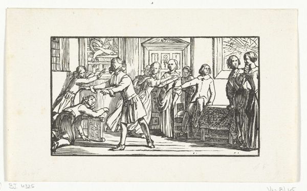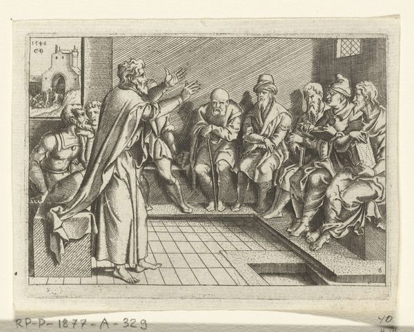 Editor: This is Dirck de Bray's print, "Pilatus wast zijn handen in onschuld," made sometime between 1635 and 1694. The scene feels incredibly tense, with this very deliberate act of Pontius Pilate washing his hands. How do you interpret the social commentary within this historical moment captured in the engraving? Curator: The act itself, Pilate publicly cleansing his hands, is a powerful performance of detachment. It speaks volumes about institutional power, doesn’t it? De Bray depicts the precise moment when political authority seeks to absolve itself of moral responsibility. What message do you think this sends to its audience regarding the political power of images? Editor: I suppose it is meant to condemn not just Pilate but also the viewers who stand by idly while injustice occurs. It seems to encourage the viewer to examine his own responsibility toward society. Is this related to some trend in baroque art, though? Curator: Absolutely. The Baroque period was a time of intense religious and political upheaval. Artists used narratives, like this scene from the Bible, to reflect on contemporary issues of power, morality, and public responsibility. How do you see this work functioning within a larger network of religious imagery at the time? Do you think its message was widely understood and accepted, or could it have been interpreted in different ways depending on the viewer’s social or political affiliations? Editor: Thinking about the diverse audiences that could've viewed this print, it makes me wonder if this piece was intended to promote a specific political position or agenda. The role of religious art at this time was maybe not only to educate or illustrate but also to sway public opinion, maybe? Curator: Precisely. The visual arts often operated as tools for propaganda. Considering that, how does your understanding of this image evolve? Editor: That’s an interesting thought—it reframes how I see art of this period and reminds me to question whose perspective is being presented and why. Thank you. Curator: And I think understanding its political role really underscores how relevant images can be to society!