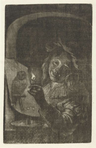 Editor: This print, "Old Woman and a Boy with Candles," dating from the early 17th century, appears to be an engraving. There's a very intimate feeling to it; the way the figures are illuminated in the dark, huddled together, creates this sense of quiet observation. What do you see in this piece? Curator: I see more than just quiet observation; I see a powerful statement about visibility and invisibility. Think about it – we have an older woman, often marginalized in society, and a young boy, both illuminated by the light of knowledge, literally represented by the candle. In a world that often overlooks them, this image reclaims their space. Consider also how this genre scene reflects the broader Dutch Golden Age preoccupation with domestic life, but filtered through the lens of class and age. What does it mean to portray these subjects, who were not usually centered, with such care? Editor: That’s interesting. So you’re saying that the choice of subject itself is a kind of political statement? Curator: Exactly. And it asks us to confront uncomfortable truths. Old age, poverty, and childhood were not always seen as worthy subjects in art, particularly portraiture. By giving these figures a central role, the artist is challenging the existing social hierarchies and inviting us to reconsider who is considered worthy of our attention. Look closely at the contrast between the deep shadows and bright light; what emotions does it stir within you? Editor: I hadn't thought about the shadows in that way before! It definitely highlights the subjects, pushing them to the forefront and makes it difficult to ignore the emotionality that radiates from their faces. Curator: And isn't that the point? To force a reckoning? To make visible what is often unseen, unheard, unacknowledged? Editor: I’m really beginning to see the importance of considering historical and social contexts to more fully understand the narratives within a seemingly simple domestic portrait. Thank you! Curator: My pleasure. It’s in questioning these seemingly simple images that we unveil the deeper, more profound dialogues they provoke.
