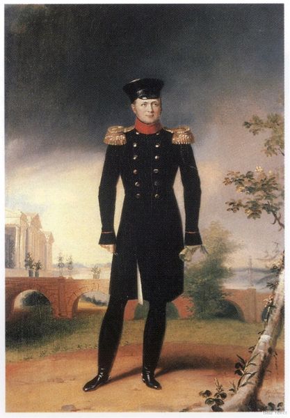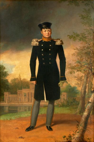 Editor: Here we have George Dawe’s "Portrait of Count Alexey Arakcheyev," painted in 1823. It's oil on canvas, depicting a stern-looking man in military dress. The background is quite bleak. What do you see in this piece beyond a formal portrait? Curator: Well, beyond the surface, it's crucial to understand Arakcheyev's deeply controversial role in Russian history. He was a key figure in implementing autocratic policies under Alexander I. Consider how Dawe positions him against the backdrop of military buildings; does that symbolize anything to you? Editor: I suppose it emphasizes his military authority? Curator: Exactly. But I think it also hints at the brutal discipline and oppressive atmosphere associated with the military settlements Arakcheyev oversaw. We need to examine the implications of power and the representation of figures who embody authoritarianism. How might his stern expression play into that reading, do you think? Editor: It definitely projects an image of strength, maybe even ruthlessness. It seems the artist made a choice to highlight his unyielding persona. Curator: Precisely. This portrait, while seemingly straightforward, can be viewed as a critical examination of power, control, and the legacy of figures who shape history through oppressive means. Considering Romanticism's interest in the individual and the sublime, does Arakcheyev's portrait fit neatly, or does it offer something more complicated? Editor: That gives me a lot to think about. It shifts the focus from simple representation to the politics inherent in portraiture. Thanks! Curator: My pleasure. It's about digging deeper, isn't it, and revealing the complex layers beneath the surface.