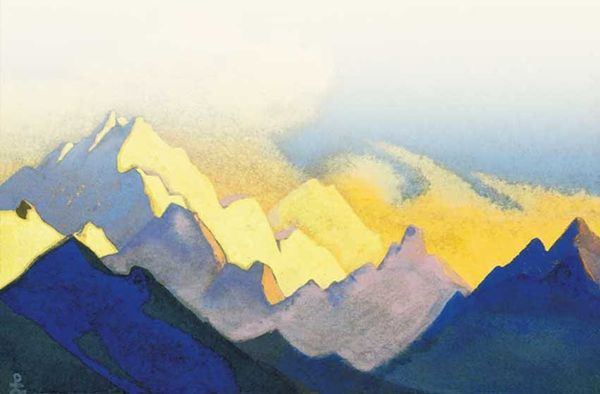This painting of a mountain range, titled Urusvati, was made by Nicholas Roerich with what looks like tempera or a thin oil. Look at how the mountains are built up from flat planes of colour and how they almost feel like a model! The paint application is quite thin, so the texture of the canvas is still visible. The palette is limited to blues, oranges, and purples, giving the scene an otherworldly glow, a kind of transcendental quality. Notice the bold shapes of the peaks against the paler lilac sky, like simplified, geometric forms almost. This makes me think of other artists like Marsden Hartley who were also interested in simplifying landscapes into abstract shapes and symbolic forms, but Roerich's mountains have a unique mystical quality, a sort of dreamscape. Ultimately the painting leaves itself open to interpretation, which is how art invites you in!