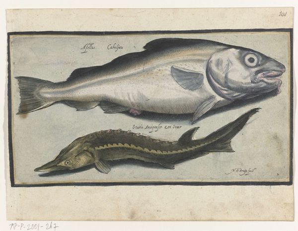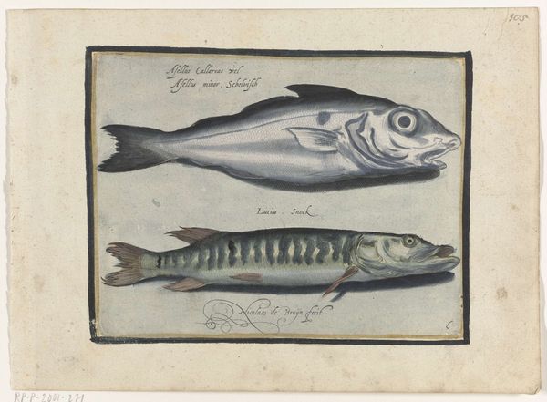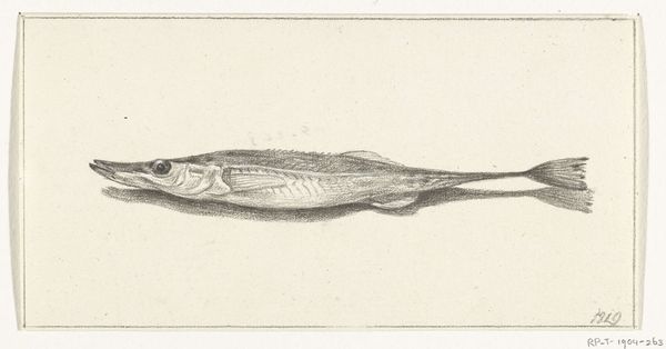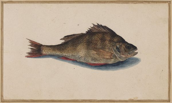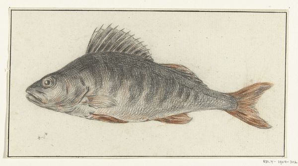 Jean Bernard created this drawing, titled Vis, with pen in brown, brush in color, and gray wash. The fish is positioned horizontally, centrally in the frame. Bernard has captured the specific texture and tone of its skin with delicate strokes of brown and grey wash. This meticulousness invites the viewer to consider the fish not just as an object of natural history, but as a study in form and line. The rendering of the fins and tail, with their radiating lines, suggests movement, contrasting with the stillness of the subject. The empty space around the fish is not merely background but contributes to the composition by isolating the fish, thus focusing attention on the intricate details of its anatomy. The artist's choice to foreground such a subject destabilizes traditional hierarchies of artistic subject matter and challenges our preconceptions. The artwork's meaning is created by the interplay between representation and abstraction, observation and interpretation.