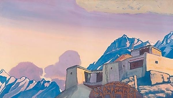 Editor: So, this is "Tibet Stronghold" painted by Nicholas Roerich in 1932. It's tempera on canvas. Immediately I’m struck by how… theatrical it feels. Almost like a stage set. What do you make of it? Curator: A stage set, yes, absolutely! That’s the Roerich magic – distilling a sense of place and mystery into something both epic and deeply intimate. I see it as a sort of… dreamscape, rendered in those incredible blues and purples. Notice how the architecture, while imposing, almost seems to rise organically from the mountain itself. What does that suggest to you? Editor: I suppose it suggests a harmony, a connection between the human and the natural world? It definitely has a spiritual quality. Curator: Precisely! Roerich was deeply interested in Eastern philosophy, especially Tibetan Buddhism. He believed art could awaken the soul. That fortress isn't just a building, it’s a symbol of inner strength, a citadel against the storms of life. Notice how small the stars seem – suggesting a vastness beyond our understanding. Does that amplify its spiritual aspect for you? Editor: It does. The scale is disorienting, but in a beautiful way. It’s both solid and ethereal at the same time. Curator: Yes, and that tension, that interplay of contrasts is what makes Roerich so compelling. He asks us to look beyond the surface, to find the sacred in the everyday. Do you think he was successful? Editor: I think so. I definitely feel a sense of peace, even in the face of such monumental architecture. Curator: And that’s the gift, isn’t it? To find serenity amidst the grandeur. A lesson this old painting whispers still today.