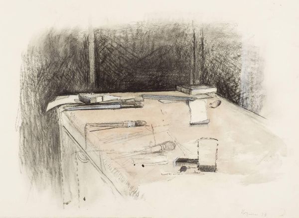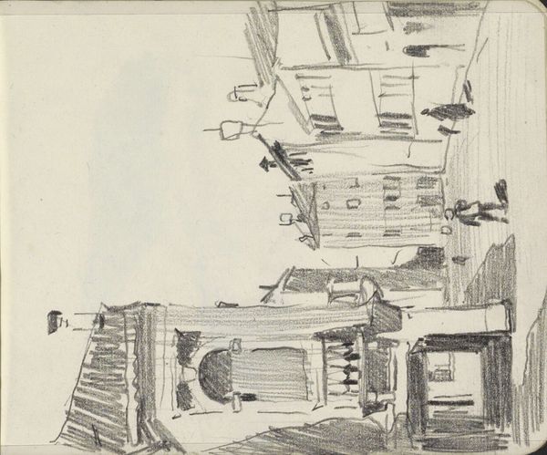 Curator: Right now, we're looking at "Kitchen," a graphite drawing made in 1922 by Kuzma Petrov-Vodkin. Editor: My first impression? Hauntingly still. All those utensils and surfaces...it feels like someone just stepped out for a moment, or maybe vanished entirely. Curator: Yes, there's a strong sense of absence, even with the detail of the graphite lines. For Petrov-Vodkin, who was deeply concerned with the fate of Russia after the revolution, ordinary spaces became imbued with complex meaning. Kitchens, in particular, as a backdrop to both care work and familial conflict. Editor: Care work is exactly the key. Look how much space is dedicated to what we can interpret as labor but also domesticity, what's been coded and allocated as women's work across history. We see items and objects as clues and archives from daily life. It makes me wonder who was laboring in this kitchen, and what were the constraints they dealt with. Curator: Absolutely. And remember the date, 1922, only a few years after the upheaval. There’s both nostalgia and disillusionment hanging in the air, don’t you think? The lack of color amplifies this for me...as though he were rendering a faded memory rather than a lived reality. It’s melancholic, you can feel the atmosphere as one reflects. Editor: It does push beyond just representation. Those geometric lines… it almost feels like he is trying to capture not just a kitchen, but the very *idea* of a kitchen – a site where gendered roles played out and solidified for generations. Like a sociological diagram rendered in graphite, you know? And there is definitely commentary on class structures implicit here too, and what is lost when labor gets erased from grand historical narratives. Curator: I can feel the weight in this room that Petrov-Vodkin captures with such precision; there’s something so compelling. I see how art can truly transform space, it really makes one ruminate about labor, value and care. It also opens my awareness of this same value and recognition in my personal life, how and whom I’m offering it to. Editor: Yes, and art can push us beyond the aesthetics. What stories are unseen in what we value? It’s a beautiful interrogation.