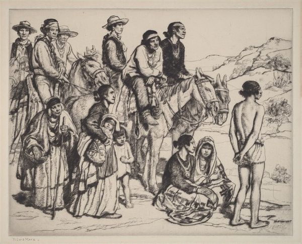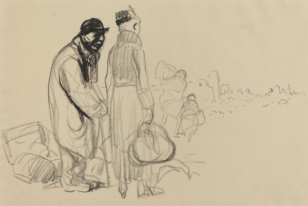 Editor: Jean-Louis Forain’s drawing, “C’est trop dangereux pres de votre ambulance,” probably made between 1914 and 1919, is just… intense. The stark lines and the obvious tension are unsettling. I wonder, what jumps out at you when you see this piece? Curator: It throws me right into the thick of it, doesn't it? Forain’s sketch-like approach, like capturing a fleeting memory, puts us almost voyeuristically at the scene. The rawness amplifies the terror and the warning of the inscription… it’s a drawing, yet screams with immediacy. Notice the economy of line… everything is essential to convey that sense of palpable dread. I’d wager that those subtle choices mirror the fractured mental states surrounding the First World War. What does it conjure for you? Editor: Definitely a sense of being in the moment, with very high stakes. It’s unnerving, actually, especially how little color is used; the figures are so bare and vulnerable-looking. It’s hard to believe such emotion can be conveyed with so little. Curator: Exactly. It's the power of suggestion, that's the true art. I’m particularly struck by the title. "It's too dangerous near your ambulance." As an artwork intended to elicit emotional connection from its audience, does this artwork make you reflect on danger? Editor: Absolutely. It makes you think about where people sought safety and shelter and how even those places were threatened in wartime. It really gets under your skin. Curator: And perhaps, lingers there… nudging at our collective consciousness, even now. What I see in this image isn’t a depiction of the end of the First World War; instead, it shows the beginning. Editor: It makes the phrase “Never forget” hit a lot harder now. Thanks!