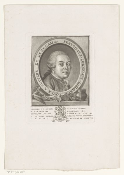Curator: Looking at this Baroque engraving from the mid-17th century, an immediate observation is how the textures almost feel imposed rather than inherent to the figure. Editor: Indeed. The work is a portrait of Johann Schweikhard von Kronberg by Johann Hogenberg. Consider the labor involved in creating these very fine lines on a metal plate and the access one needs to produce one. Curator: I agree. Looking closer, you can discern that the work has the effect of aggrandizing a figure invested with considerable religious and secular authority; observe the oval border emblazoned with the symbols of the man's offices, almost weaponized in their effect on the beholder. It places him distinctly within the sociopolitical hierarchies of his era. Editor: Precisely. Engravings like this were crucial for disseminating power and influence in an age before mass media. It would require incredible precision with the burin to produce those varying line weights, and we should ask ourselves where Johann received his materials and whether Johann was able to express their artistry at every level. Curator: Thinking about von Kronberg's role as Archbishop, how does his status shape the representation of masculinity? This isn't the rugged, warrior-like depiction we often see; it's refined, intellectual. The choice of medium and style arguably elevates his perceived status, but also renders it a fragile construct of presentation and visual manipulation. Editor: Good point; though what’s most striking is that even if the final image produces status and reverence, engravings themselves were fairly reproducible for consumption within certain classes and across the Hapsburg Empire. It invites reflection on the economies that gave way for portraits like this one. Curator: I’m drawn to how it illustrates the dynamics between visibility, representation, and power within a society steeped in religious doctrine. Editor: And I find myself impressed by the intricate workmanship—the craft itself elevating subject to power.